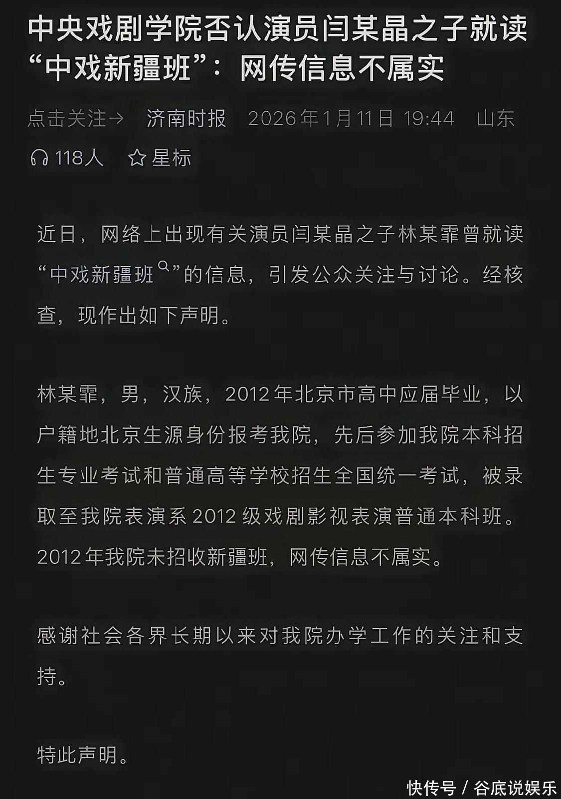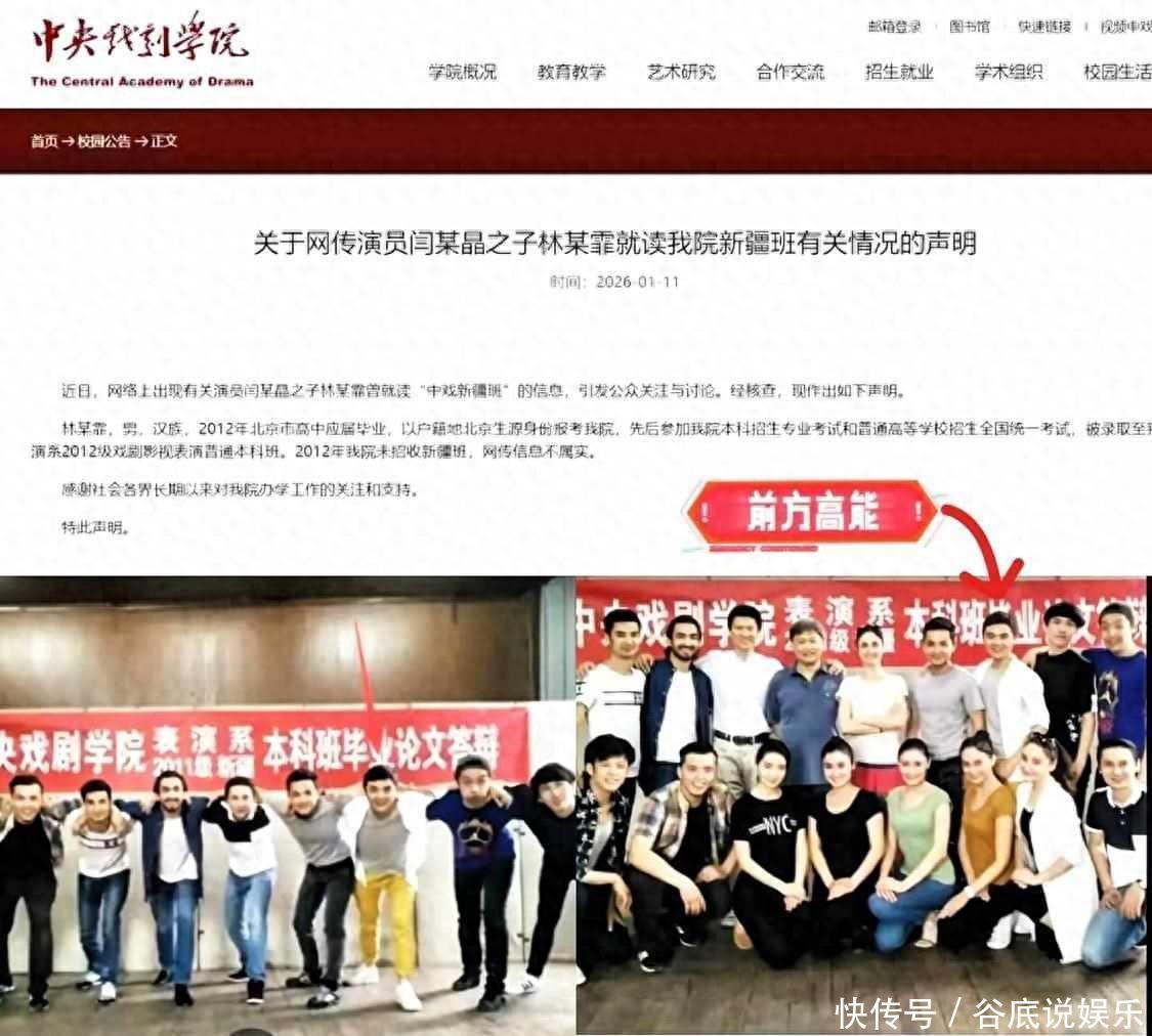 这件事说起来有点复杂,中央戏剧学院前几天发声明说林傲菲是在2012年凭北京户口考进表演系普通班的,那一年学校根本没有开设新疆班,可是网上有很多视频拍到林傲菲参加2011级新疆班的毕业答辩,现场挂的横幅清清楚楚写着“新疆班”三个字,而且他妈妈闫学晶在直播里亲口提到自己儿子就是新疆班的,这样一来大家就搞不清楚到底哪边说的是真的。